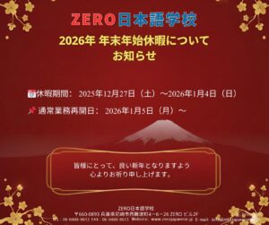 ZERO日本語学校では、以下の期間を年末年始休暇とさせていただきます。 📅 休暇期間2025年12月27日(土)~2026年1月4日(日) 📌 通常業務再開日2026年1月5日(月)より通常通り再開いたします。 本年も多......